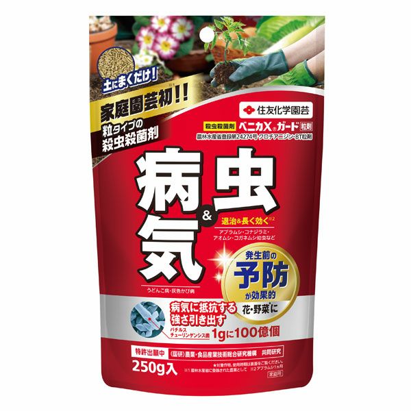 他の画像を見る 家庭園芸では初!簡単、土にまくだけ! 住友化学・ベニカX ガード250g 価格 ¥ 1,078 税込 +説明 土に混ぜる殺虫剤。土の中に潜むネカイガラムシなどにも効果があります。予防効果も高いので「虫が発生したからまく」といよりは「虫対策(予防)」として有効。屋外の植物向けです