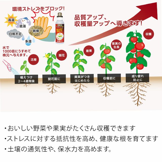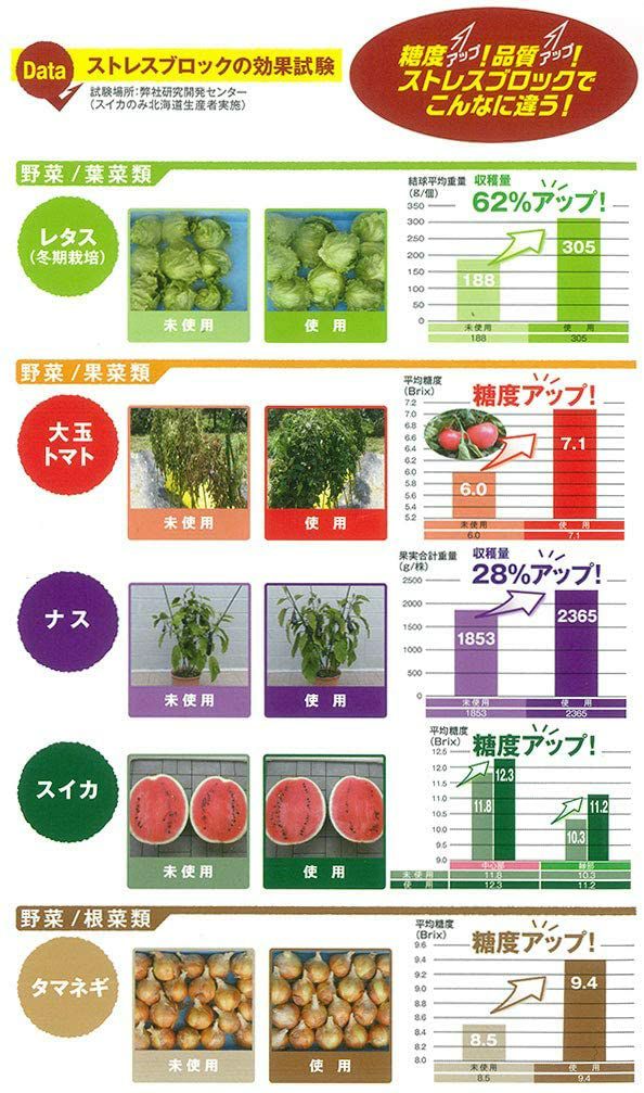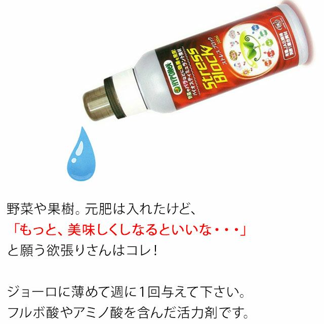 他の画像を見る 果樹や、バラにもお勧め! 野菜の糖度&収穫量UP!ストレスブロック(500ml) 価格 ¥ 1,815 税込 +説明 ハイポネックス社おすすめの新商品。野菜やバラなどに効果!日照不足や高温ストレスを緩和し、収穫量アップや糖度アップへ導きます。植物は複数の肥料や活力剤を与えることで、よりよく育ちます。
