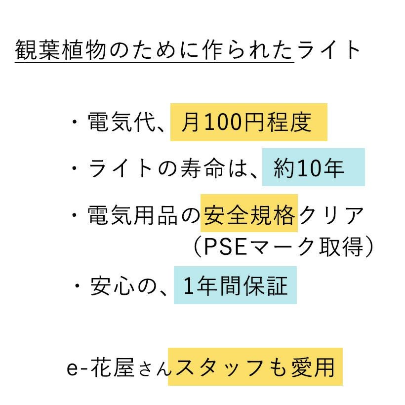 他の画像を見る 部屋が暗くても、植物をあきらめない! 「観葉植物のために設計された」育成ライト(プランツネクスライト) 価格 ¥ 8,800 〜 ¥ 9,850 税込 価格 ¥ 税込 +説明 e-花屋さんは「観葉植物の専門店」。1番おすすめしたい植物ライトは、高島屋植物園と豊川温室が作ったPLANTS NEXLIGHTです!アマテラスなどアロエ向きのライトに比べ安くて、品質が良いのが特徴です!