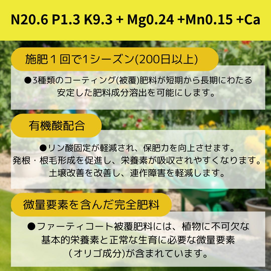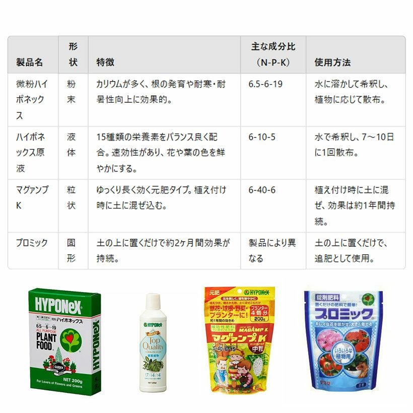他の画像を見る 葉の色を鮮やかに、丈夫に育てる! 置くだけ・簡単!固形肥料プロミック150g いろんな植物向け・観葉植物向け 価格 ¥ 579 税込 +説明 土に置くだけ、初心者おすすめ固形肥料(化成肥料)。液体肥料だとついつい忘れてしまう、肥料のタイミング。プロミックはゆっくり効くので施肥の時期はあまり気にする必要がありません。虫もよりつきにくい!