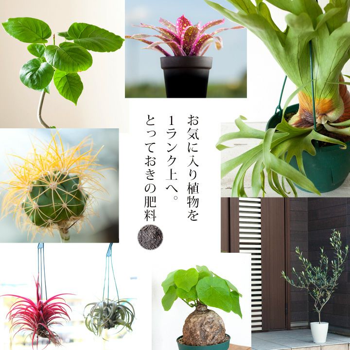 堆肥(植物由来)を基に作られた肥料です。 使い方は簡単です! 普通の肥料同様、土の上に置いたり、元肥として土に混ぜて使用します。 成分:食品工業汚泥、おがくず、剪定枝破砕材、食品残さ 対象は植物全般 花木(オリーブやユーカリ等、屋外の花木。ゴムノキやウンベラータなど全般に) 観葉植物(塊根植物やビカクシダ、モンステラ、エアープランツやサボテン、カラテアなど全般に) |