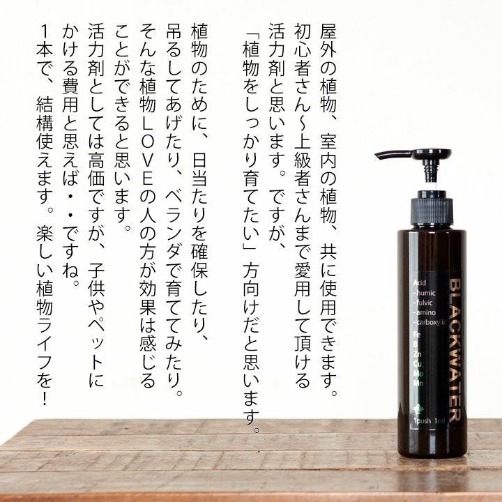 水やりの際、その水に混ぜて使う活力剤です。1,000~5,000倍希釈でご使用ください。 使い方は簡単。1リットルのペットボトルに1プッシュで5,000倍の希釈液が作れます(1プッシュ0.2ml)。 ・当初は5,000倍から始めて様子を見ながら濃度を調整してください。 ・週1~3回を目安として水やりの際に与えてください。 ・植物の生育期に使用します。 主成分: フミン酸、フルボ酸、アミノ酸、カルボン酸、鉄、ホウ素、亜鉛、銅、モリブデン、マンガン 対象は熱帯観葉植物全般です (例)ビカクシダ、ティランジア、タンクブロメリア類、塊根植物類、ゴムノキ類、 モンステラ他のサトイモ科類、サボテン類、カラテア類 |