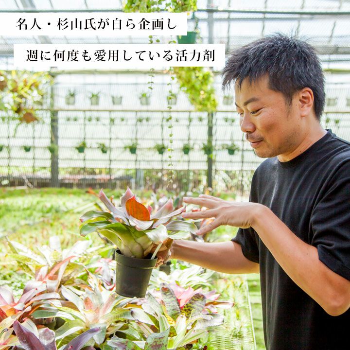 「根を強く張り巡らせたい」 「自生地の姿に近づけたい」 「葉を硬くしっかりと栽培したい」 NHK「趣味の園芸」でもお馴染みの栽培家、杉山拓巳氏が「こんな活力剤が欲しい!」と自ら作った活力剤。 インテリアとして植物を育てるならば。変な話、肥料を全くやらずとも1~2年は耐えてくれます。 ただ植物を愛し、植物本来の美しさを引き出したいと思えば肥料は不可欠。 ただその前に!「肥料を吸収しやすい、健康的な株」にすることで、肥料効果はさらに高まります。 そんな代謝の良い株を作るのがこの活力剤。 「植物は自生地の姿が1番美しい」 杉山氏は世界各地の自生地を周り、その美しさに魅了。その姿を再現するような栽培を目指したいと考えました。 軟弱な株に肥料を与えれば、肥満気味の株になってしまいます。 そうでははくまずは「代謝の良い健康的な株」を作り、そこに肥料を与えることで「引き締まった硬い株」に近づけたい思ったのです。 自生地の養分(落ち葉等に含まれる腐植酸に代表される成分)を主成分として、フミン酸・フルボ酸・アミノ酸等を配合。これらは根が求めていく成分です。根張りを良くします。 また鉄・ホウ素・亜鉛・銅といったミネラル分も配合。これらは植物自体を健全にし、肥料を吸収しやすくします。 |