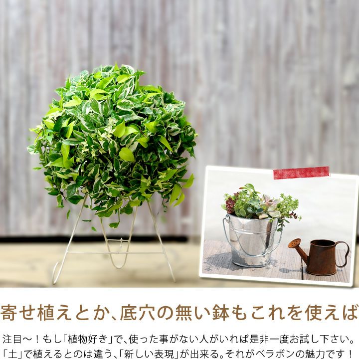 「排水穴の無い容器」や、アートの様な寄せ植え(ギャザリング)を作る事ができる、「従来にない用土」です。 我が家ではこのベラボンを使い、ビーカーやケーキカップに観葉植物を植えて楽しんでいます。 これに植えると管理が楽だし、軽いので天井から植物を吊るしたりするのに、とっても使いやすいですよ! |