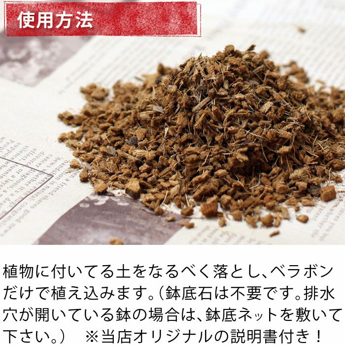 ベラボンとは、従来の培養土の替りとなる高品質なヤシの実チップです。(植物についている土を全て落とし、ベラボンだけで植え替える事が可能です。) 観葉植物、多肉植物、屋外の草花の寄せ植え(ギャザリング)等、幅広く使用できます。) ・ハイドロカルチャーの様に、鉢底穴が開いてない容器にも植える事が可能 ・一般の土と違い、「燃えるゴミ」として捨てる事ができる ・夏は通気性が良く、根の張りが良い。逆に冬は凍りにくく、根が傷まない ・軽くて清潔。ハンギングにも最適。 |