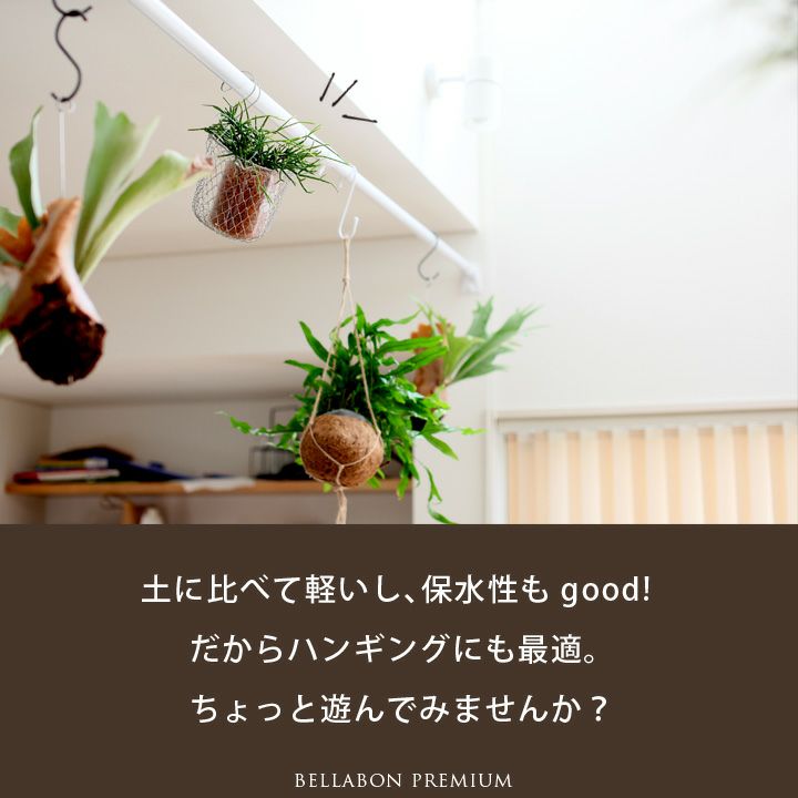 ベラボンとは、従来の培養土の替りとなる高品質なヤシの実チップです。(植物についている土を全て落とし、ベラボンだけで植え替える事が可能です。) 観葉植物、多肉植物、屋外の草花の寄せ植え(ギャザリング)等、幅広く使用できます。) ・ハイドロカルチャーの様に、鉢底穴が開いてない容器にも植える事が可能 ・一般の土と違い、「燃えるゴミ」として捨てる事ができる ・夏は通気性が良く、根の張りが良い。逆に冬は凍りにくく、根が傷まない ・軽くて清潔。ハンギングにも最適。 |