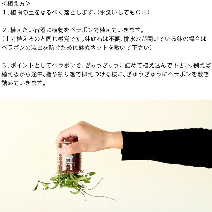 (土で植えるのと同じ感覚です。鉢底石は不要、排水穴が開いている鉢の場合はベラボンの流出を防ぐために鉢底ネットを敷いて下さい)