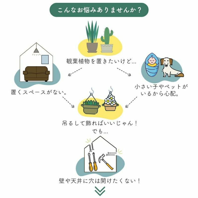 DRAW A LINEシリーズを使えば問題解決。穴を開けずとも、植物が吊るせます!(植物は吊るすとメチャクチャかっこいいです!試してみてくださぃ!)