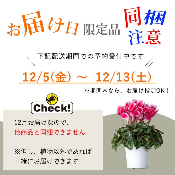 他の画像を見る 花屋のスタッフが「自分用に」買うのは、コレ! 【予約品・お届けは12/7~】亀山ブランド、長持ちシクラメン※植物との同梱は不可 価格 ¥ 3,680 〜 ¥ 3,780 税込 価格 ¥ 税込 10月~11月販売予定の商品 入荷待ち +説明 シクラメンの選び方。「長持ち」重視なら、自然開花(ホルモン剤不使用)のシクラメンを!亀山さんは「6月まで咲くシクラメンを目指して」生産されてます。底面給水ではなく1鉢1鉢丁寧に水やり。土や肥料も研究してます