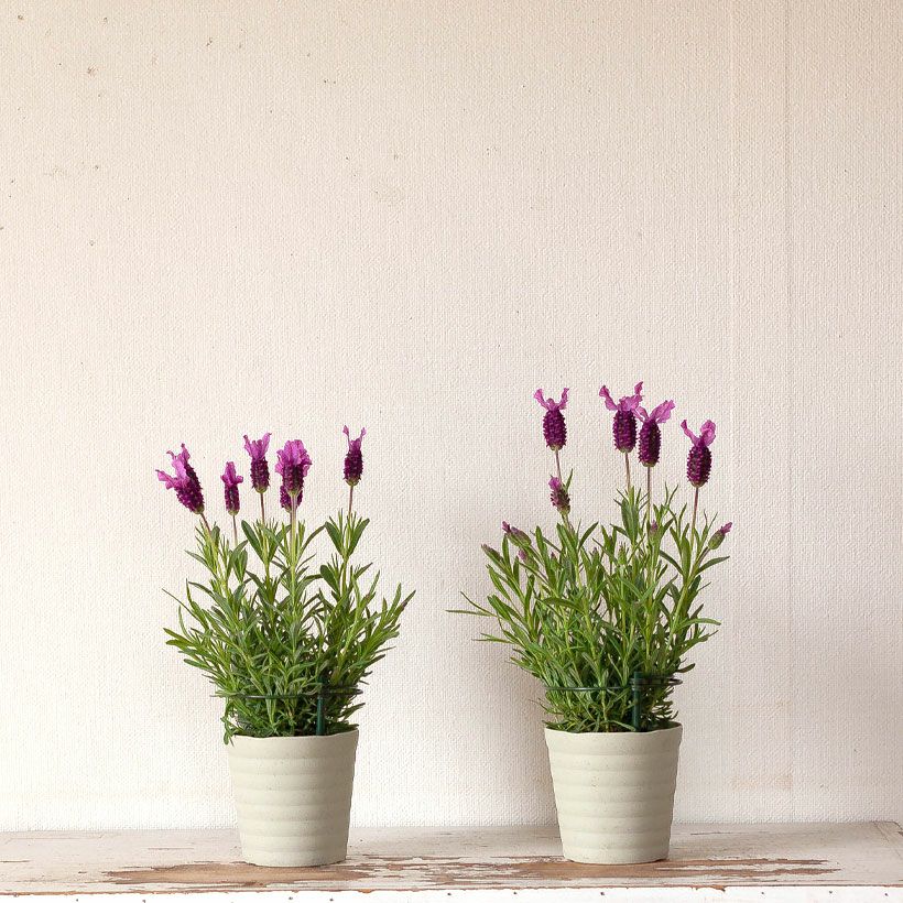 たとえば、「支柱」。フレンチラベンダーは花が大きいので、伸びると花の重みで枝が垂れてだらしなくなります。 けれど支柱があるので、花をいい位置にギュっっと集めることができます。花束みたいな、華やかな鉢植えなのです♪