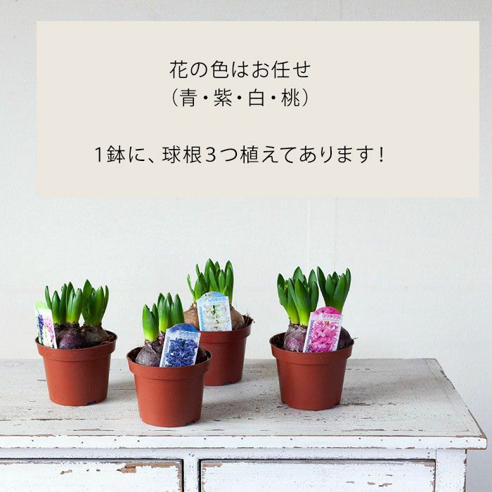 ※ヒヤシンスの色は、紫・青・桃・赤・白のいずれか。1鉢に3色植えた「花色MIX」もあります。