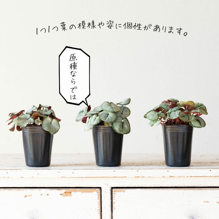 写真は見本です。株により「葉の色味や形」などが若干異なります。 お花は「これから」咲いてきます。(お届け時には、まだ花が無い場合もあります) ※鉢花のシクラメンは株が詰まった感じ。比べると少しスカスカしてます。ただこれが「原種」の特徴。野趣あふれる姿をお楽しみくださいませ。 |