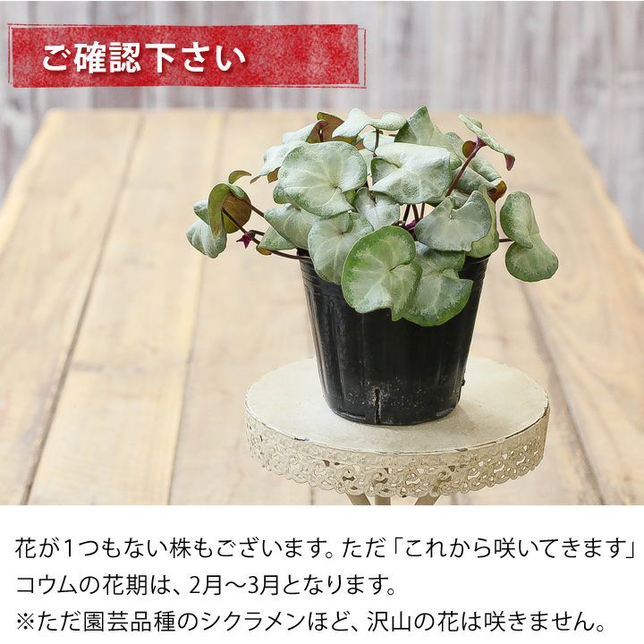氷点下10℃まで耐える、丈夫な原種シクラメン。 室内で楽しむ場合は、暖房が入らない涼しい部屋でお楽しみください。基本的には「屋外」で楽しむ植物となります。 鉢花のシクラメンは「花を楽しむ」のに対し、原種系のシクラメンは「野趣あふれる姿」を楽しみます。特に今回お届けするコウムは、コウムの中でも人気の「シルバーリーフ」。 カラーリーフとしても長く楽しめます。 毎年楽しめる宿根草として、年々少しずつ大きくなる姿をお楽しみ下さいませ。 |