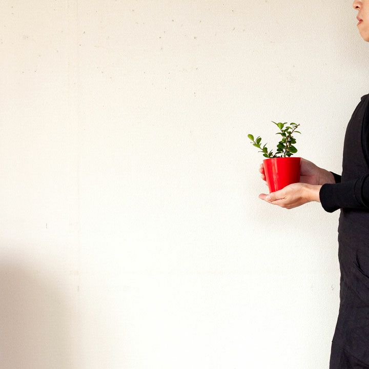 ※3号ポット苗が、赤いプラスチックの鉢カバーにストンと収まってます。半年~1年くらいは今の鉢のままでも大丈夫ですが、一回り大きい鉢に植え替えても大丈夫です。