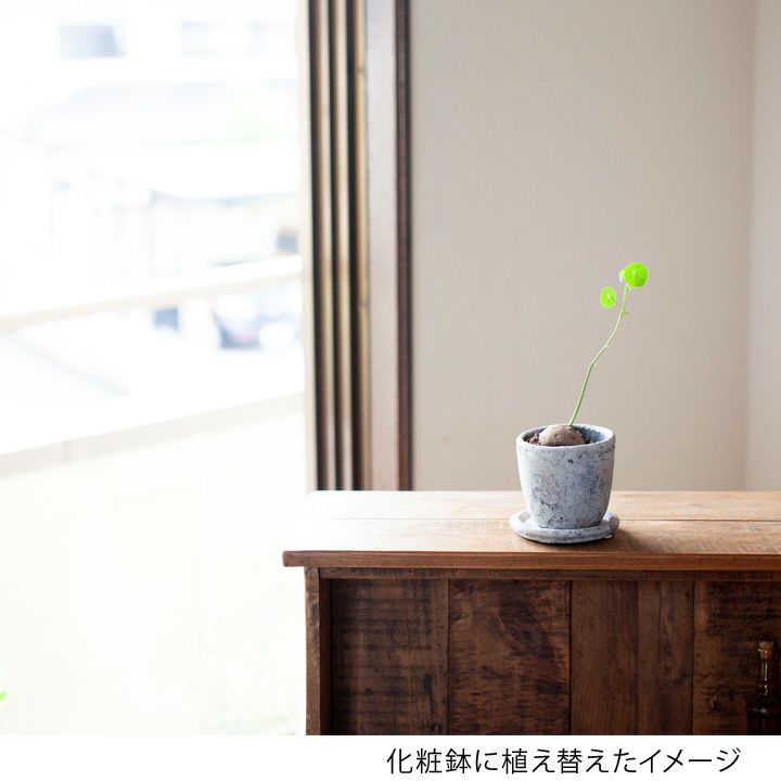 | 【育て方について】 寒くなるとツルと葉が枯れ、春になると芽が出る植物です。(冬に休眠する植物です) 塊根植物の中では寒さに強い植物です。地上部が枯れれば水は断水し、5℃以上の場所で春を待ちます。(できれば光の当たる8℃以上の場所) ツルや葉がある時はベランダや、室内の明るい場所で。多少であれば陰にも耐えますが、明るい方が理想です。 ※お届け後、鉢を替えた方が見栄えがしますが、来年の植え替えでも構いません。 |