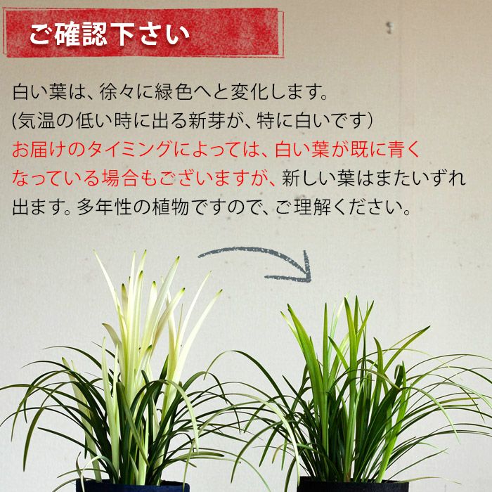 ヤブランの仲間です。暑さ・寒さに強く、丈夫な植物です。 基本的には屋外の植物です。日向~半日陰と幅広い場所で楽しめます。ただ白い葉を長持ちさせたい・・・と思えば、日陰の場所で。強い日差しは植物にとって駄目ではないですが、葉を青くします。 (明るく風通しの良い場所であれば、室内でも大丈夫です。ただ室内の場合は受皿をご利用下さい) |