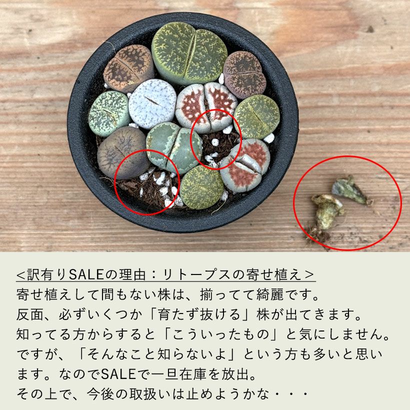 寄せ植えの一部が抜けてしまった株、花がらが残ってる株があります。これらはリトープスでは頻繁にあることです。そこも踏まえの価格となってます。ご理解の上、お買い求めください。