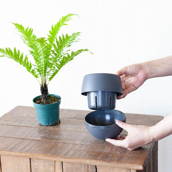 ※ボール型のプラスチックの鉢の中に3.5号のブレクナムの苗がストンと収まってます。ブレクナムは水を好む植物ですので、使い勝手がいい鉢を選びました。 |