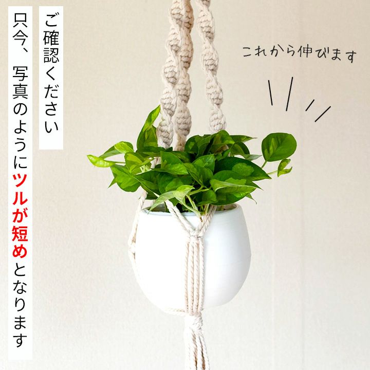 マクラメはハンドメイドで編んでいます。その為、多少サイズ誤差がございます。 また、糸が一部ほつれている箇所もございます。マクラメハンガーは、どうしてもこういった事が出てしまいます。予めご了承くださいませ。 ※天井ピンは商品に含まれません。(天井ピン(安価です)は、Amazonで簡単に手に入れることができます) ポトスのツルの長さは、季節によって異なります。 写真よりツルが短い時期がありますこと、ご理解の上お買い求め下さいませ。 |