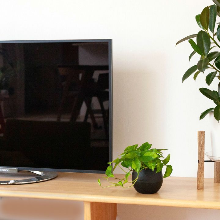 受皿不要で丸さが際立つボール鉢が、ポトスの魅力を引き立てる。