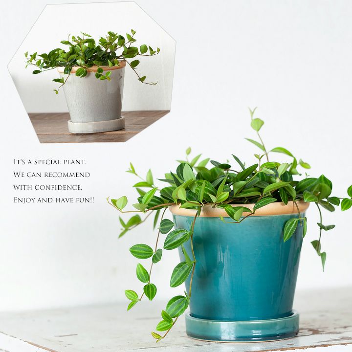 ちょっとしたテーブル、ちょっとした台に陶器のグリーンを飾ってみませんか?色がきれいな陶器鉢だからこそ、グリーンが映える。小玉スイカのような葉をもつ観葉植物、ペペロミア・アングラータ。