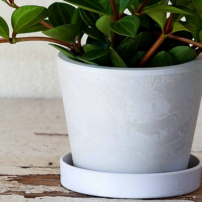樹脂製の鉢に、ペペロミアアングラータを丁寧に植えこみました。鉢には受皿が付きます。(受皿の直径は9cm)