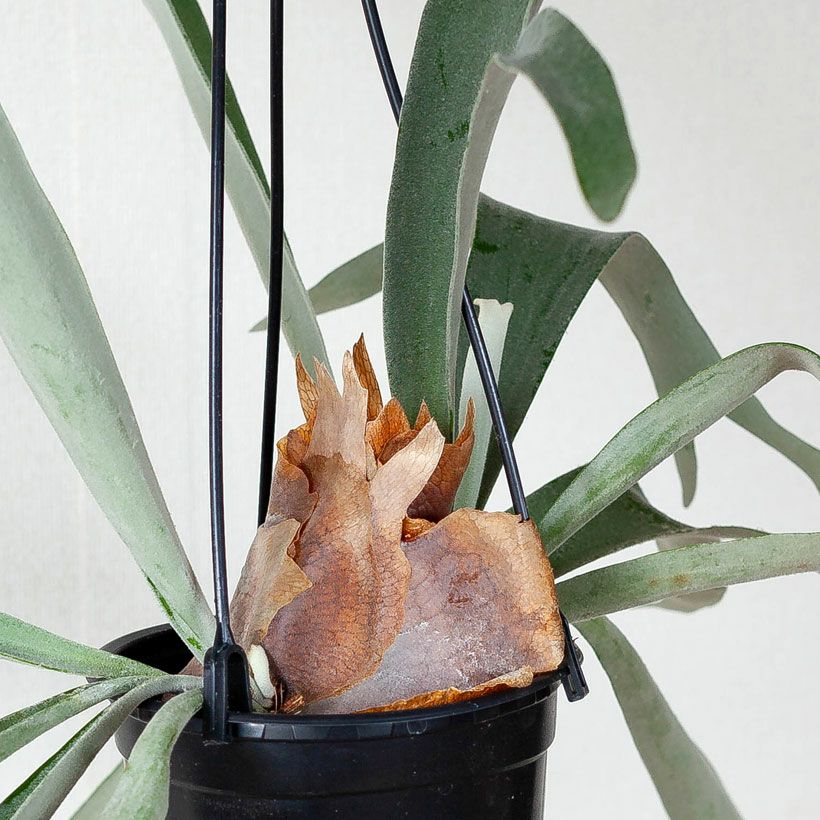 コウモリランには2種の葉があり、株元を覆うように生える葉は「貯水葉」と言われています。 この貯水葉は、 「枯れる→新葉が出る→枯れる」を繰り返します。 この繰り返しで「枯れ葉の層」を作り、その隙間に水や養分を貯めこんでいくのが特性です。 そのため、株元を覆う貯水葉は茶色く枯れている葉。破れてる葉などがあります。