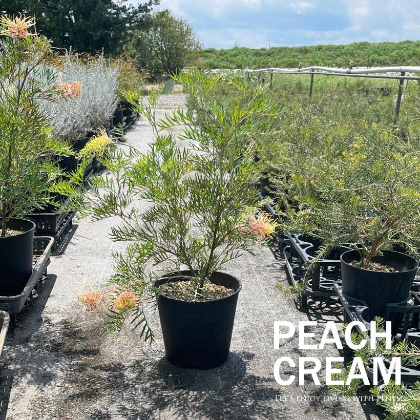 グレビレアは「花」に注目されがちですが、ピーチズ&クリームは「葉」も綺麗。日本の植木には無い、フワフワッとした独特な葉姿。多くの植木の中に、1鉢混ぜて見てください。アクセントとなり、全体の雰囲気が良くなるのを実感して頂けると思います♪