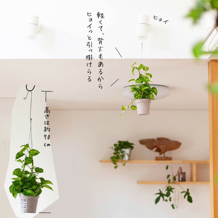 ポトス・グローバルグリーンは育てやすい観葉植物で、多少であれば陰にも耐えます。 乾燥にも耐えるので、水は休日だけでもOK。丈夫なので「吊り下げ植物」として優れてます。 時間が経てば、さらにツルは伸びます。ワイヤーに巻き付けたり、下に垂らしたりとお好みでアレンジできますよ! |