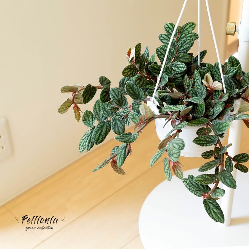 お届けするのは、吊り鉢仕立てのペリオニア。成長すると枝が伸びるペリオニアは、鳥が羽根を広げるようなシルエット。他のハンギング植物にはないビジュアルです!