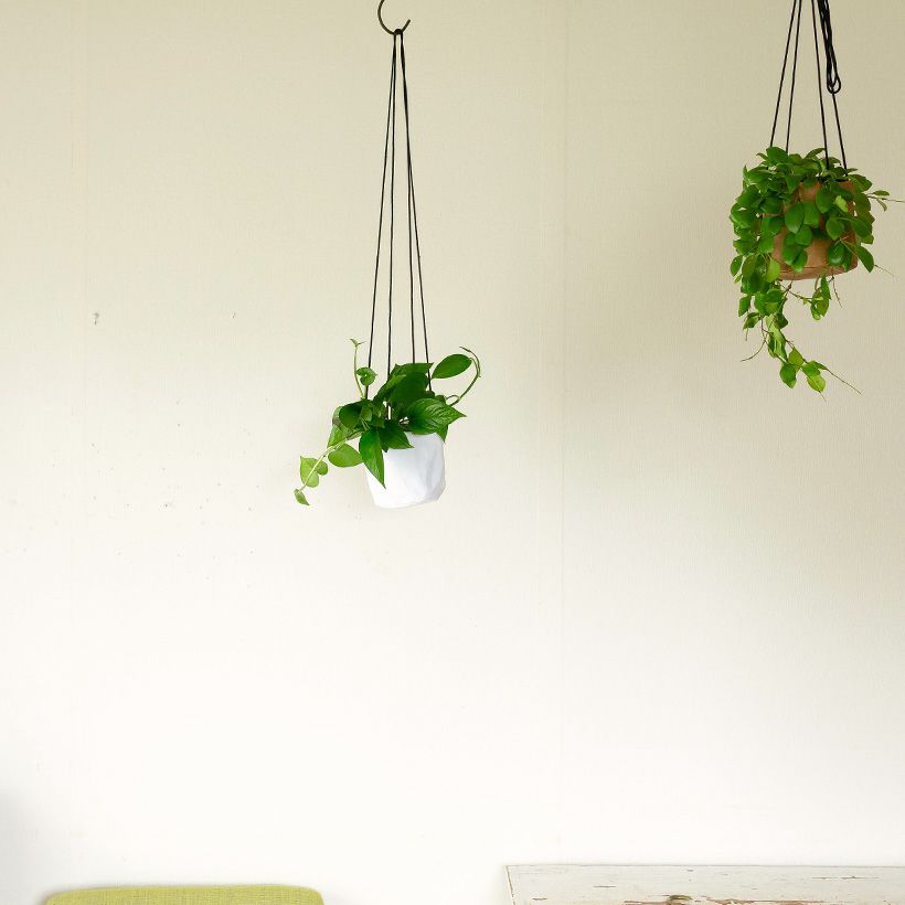 すっきりした葉が美しいポトスを、洋服みたいな吊り鉢にポットIN。とっても簡単♪