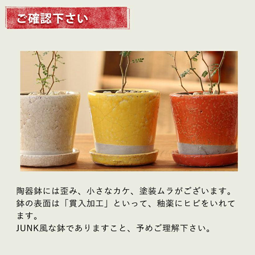 【植物について】 写真は見本です。 植物ですので、樹形は1つ1つ異なります。 【陶器鉢について】 鉢はJUNK風のデザインで、傷や小さなカケ、塗装ムラなどがあります。こういった風合いの鉢でありますこと、予めご了承ください。 |