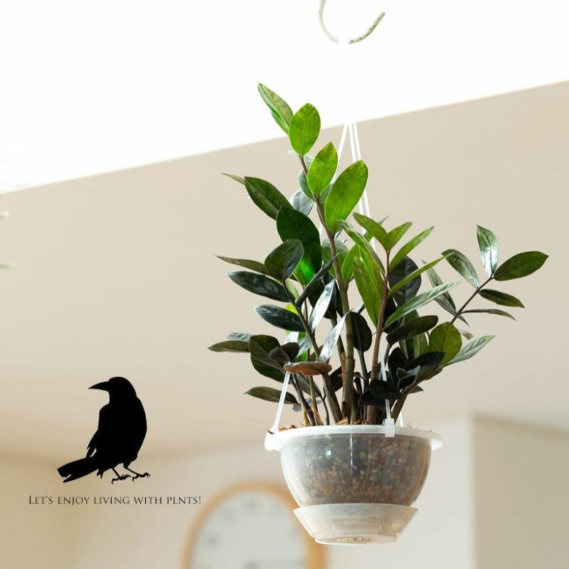 鉢は「根が見える」吊り鉢、ネガミエルAIR。この鉢は浅い形状なので、置いても可愛い。お皿みたいなシルエット、陶器鉢に負けないビジュアル。