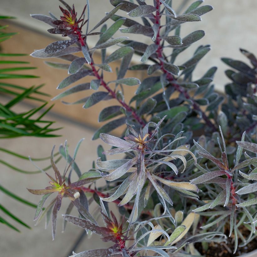 今回のリューカデンドロンは、1年を通して黒(ワイン色)っぽいのが特徴。差し色となり、他の植物を引き立てます。花は派手さはないですが、切り花やドライに使え重宝。
