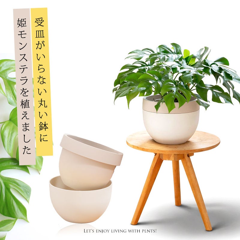 1番の特徴は、鉢と受皿が一体構造になってること。受皿がいらないので家具と調和、スッキリ飾れます。丸い形がとってもキュート♪