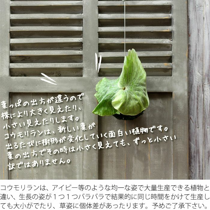 写真は見本です。 樹形や、「葉の出具合」「葉のカタチ」が個々に多少異なります。 写真も掲載していますが、コウモリランの葉には傷があります。破れている箇所も。 「コウモリランの特性」をご理解下さい→ 今現在、前に出てる葉はいずれ完全に枯れます。けれどその間に、株の中央部から新しい葉が出て、枯れた葉を覆い隠すように展開します。 「枯れる→新しい葉が出て枯れた葉を覆い隠す→その葉がまた枯れる」 を繰り返し、数年かけて葉の「層」を作っていきます。 (現生地では、この「枯れ葉の層」に栄養分をため生き延びています) コウモリランの葉は、枯れる事が宿命。 なのでお届けのタイミングによっては、葉の傷や傷みが多い場合もあります。 ただ説明のように、それは不良ではなくコウモリランの特性です。 |