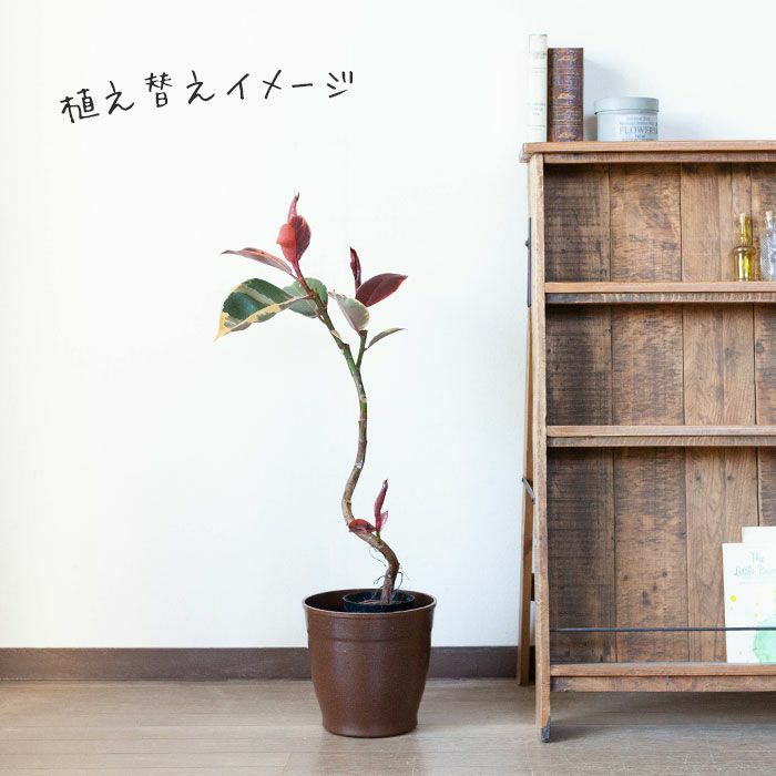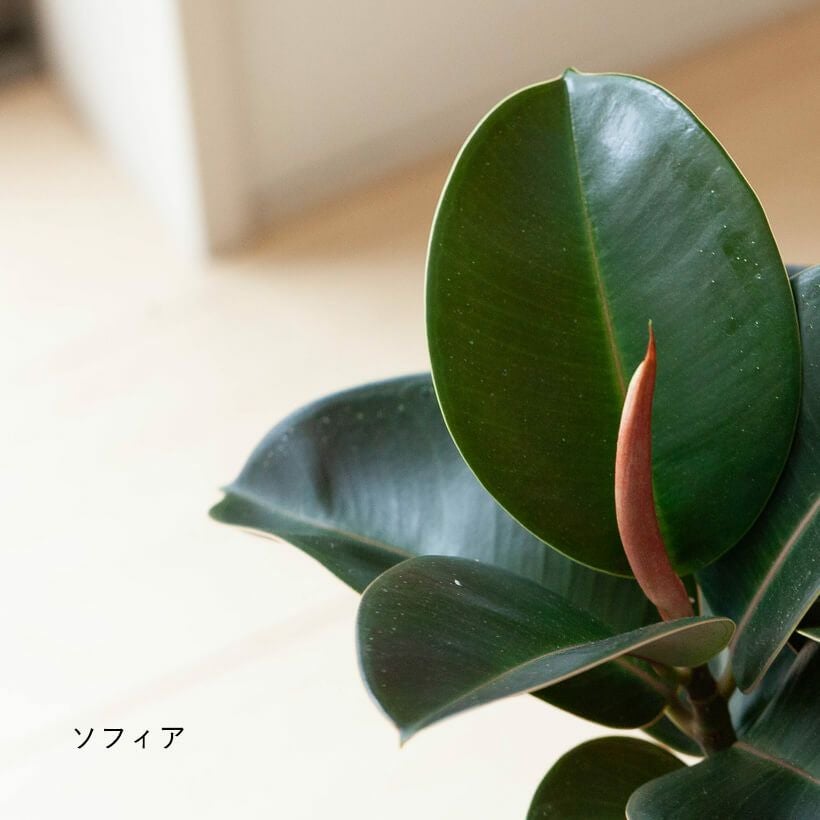 フィカスの新しい品種です。ツヤがあって厚みのある葉が特徴で、新芽は褐色寄りの赤色をしており、落ち着いた雰囲気の品種です。