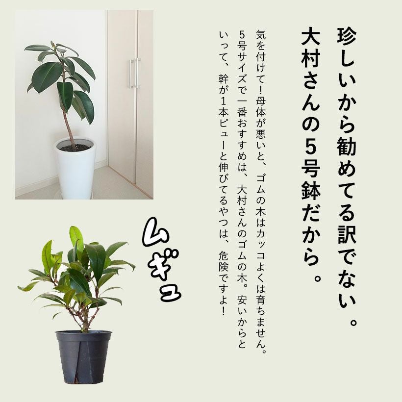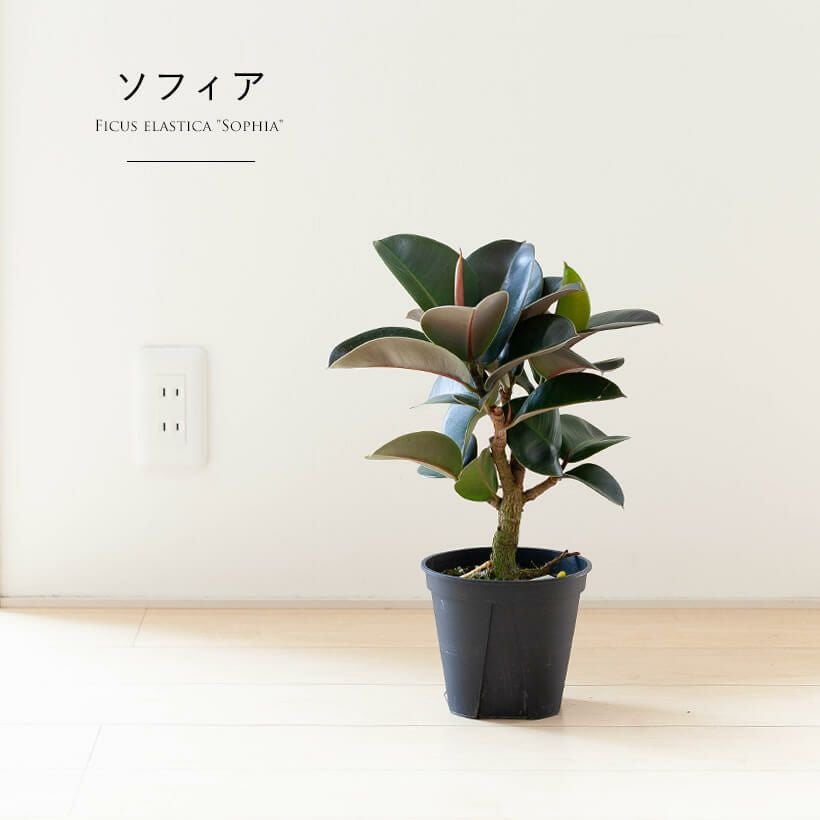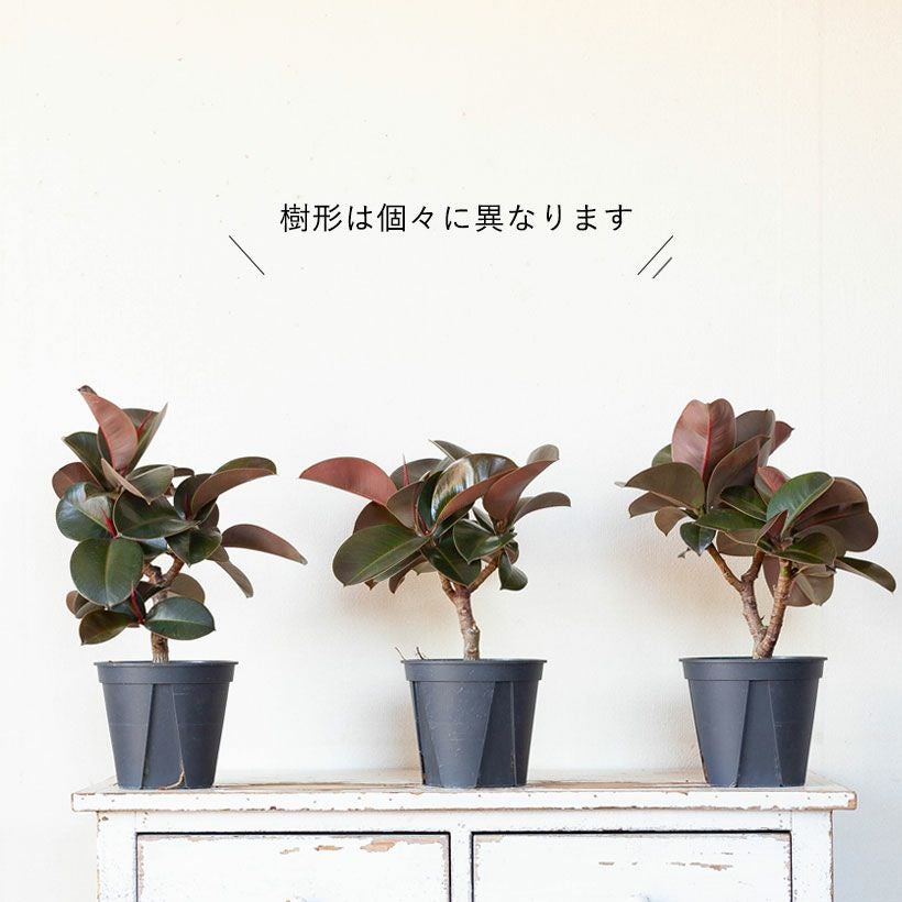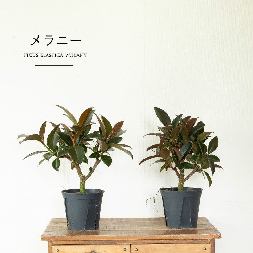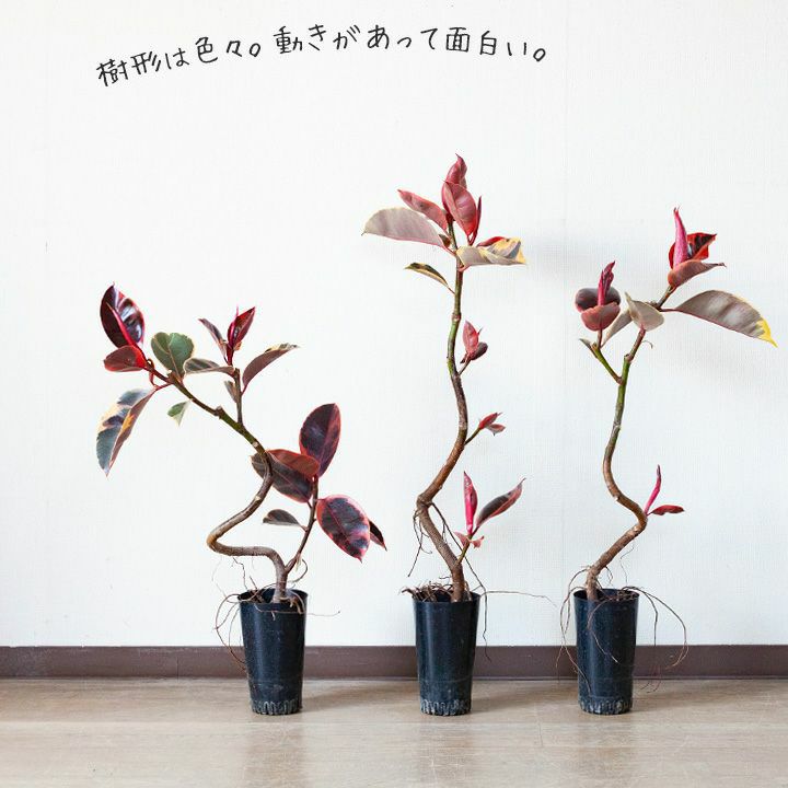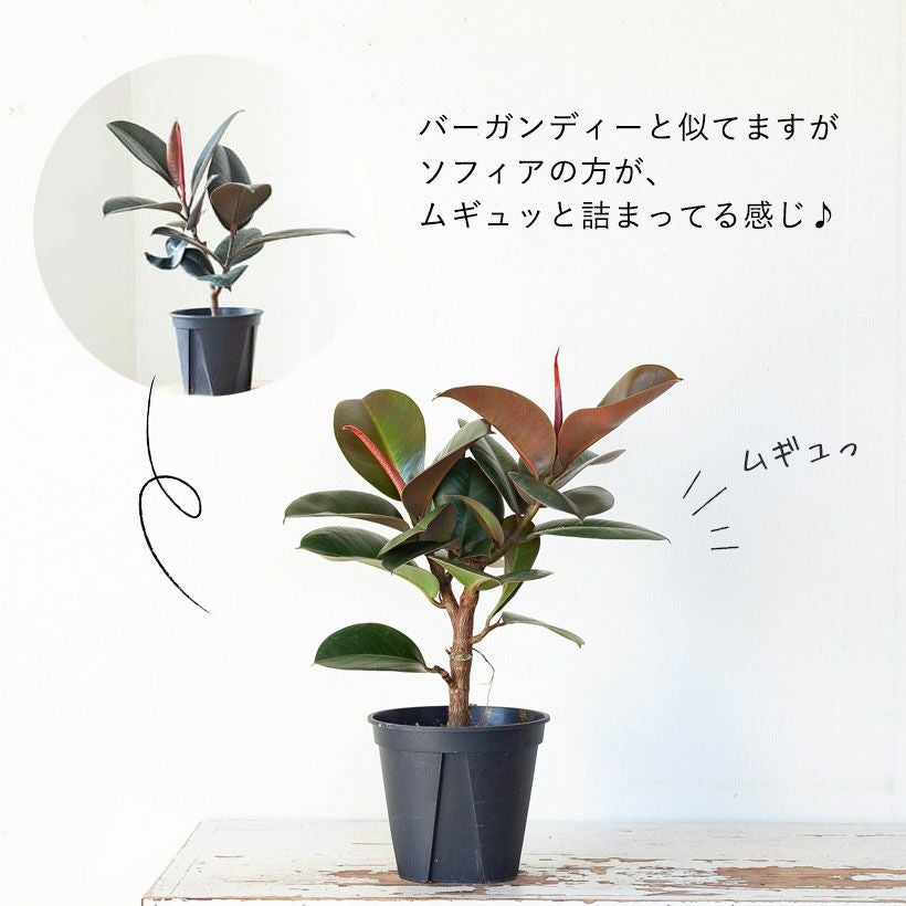 ゴムの木4品種。流通が少ないフィカス・ソフィア。小葉がたくさんつく、メラニーゴム。黒ゴムの木(フィカスバーガンディー)。そして、1番人気のベンガレンシス、どれも5号鉢サイズです!
