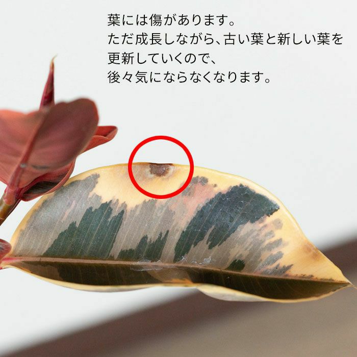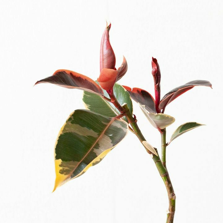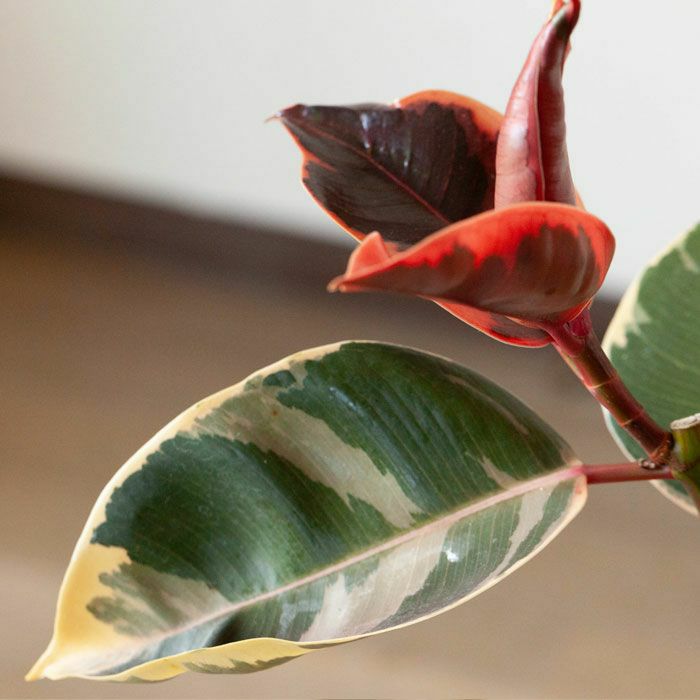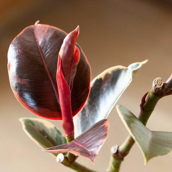ルビーもゴムノキの仲間で、名前にある通り、新芽の葉がルビー色の綺麗な色をしています。葉の模様も迷彩柄で、個性的な品種ですよ。