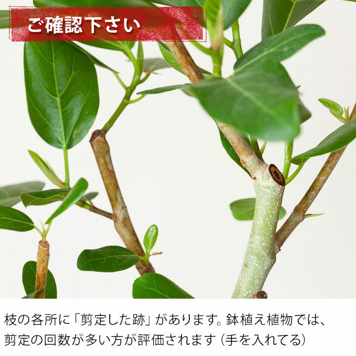 「幸せを呼ぶ」ガジュマルの木。この商品は剪定でボリュームを出させた枝を接ぎ木。一般のタイプより育て方が簡単で、枯らすリスクも少ないと思います。1~2年は植え替えの必要も無し。初心者向け!