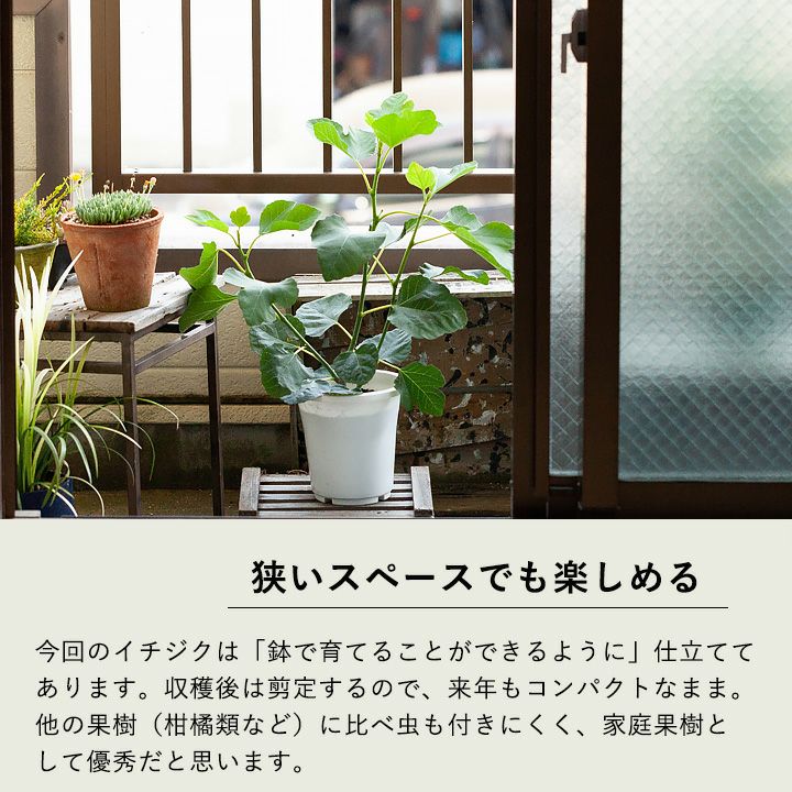 実をたくさん付けることから「千成イチジク」とも呼ばれるホワイトイスキア。ベランダでも育てることが出来るようにと、6号鉢にコンパクトに仕立てました。耐寒性もあり育てやすい品種。秋には収穫を。皮ごと食べられ、甘いです!