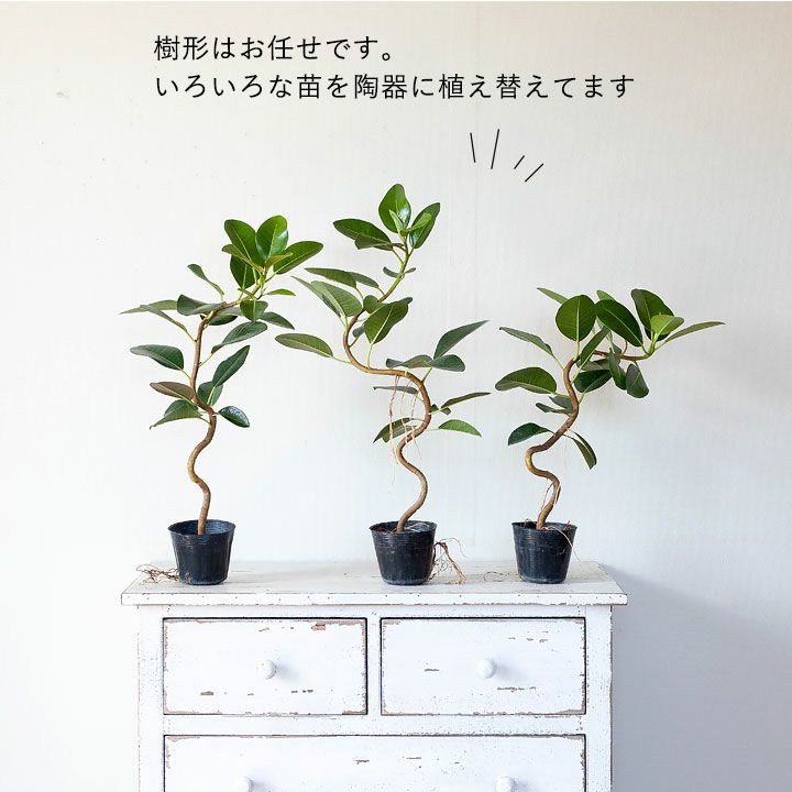 メガネみたいな葉が可愛いベンジャミン・バロックを陶器鉢で。1つ1つ丁寧に植え替えてます。人気植物で、新築祝いなどでもよく利用されます!入荷は年に数回。再入荷ボタンをクリック頂ければ、入荷の際は連絡します