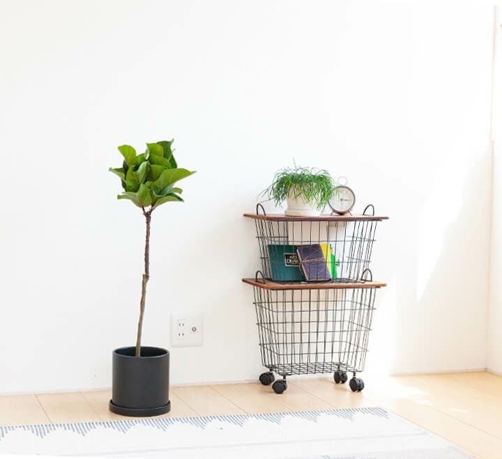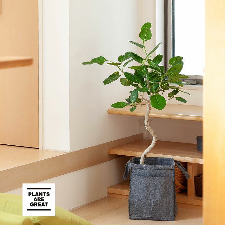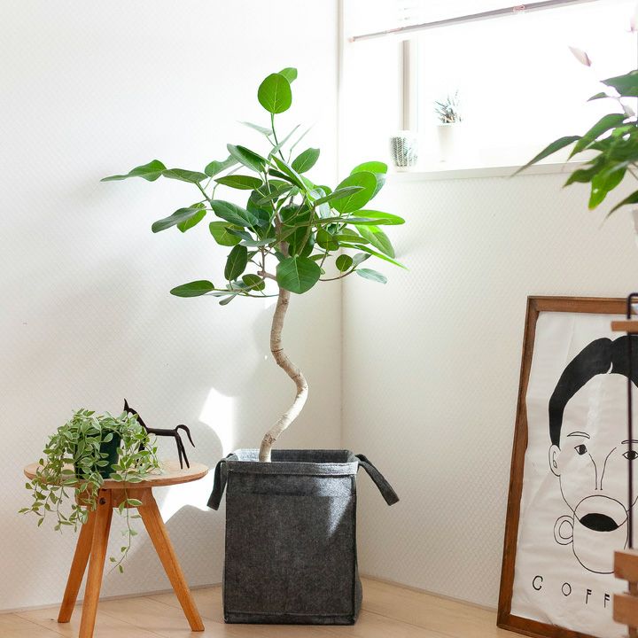おしゃれ!幹曲がりのフィカス・ベンガレンシスを、インテリアを選ばない鉢カバーに入れて。背丈1m前後の丁度いい床置きサイズ。ゴムの木は観葉植物のなかでも育てやすい植物として人気があります。