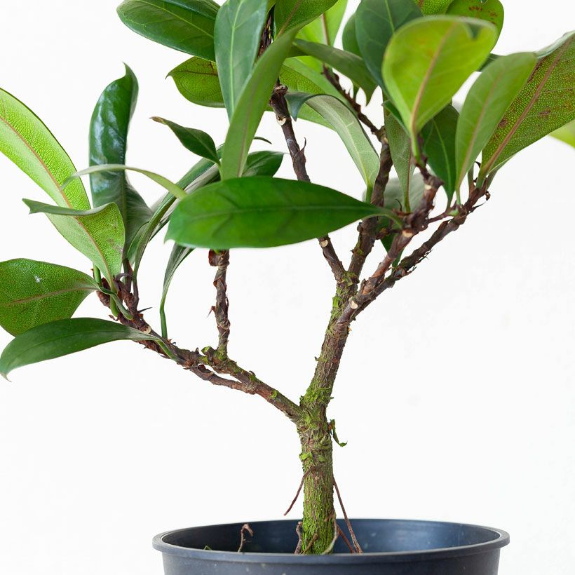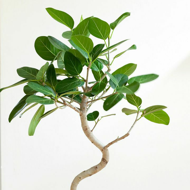 上に伸びるのではなく、ツル性で這うように枝が伸びるガジュマル(正式名はフィカスシャングリラ)。育て方のコツは光と水。普通のガジュマルより葉が多いので、水をよく吸う印象。お洒落な陶器鉢で楽しんで!