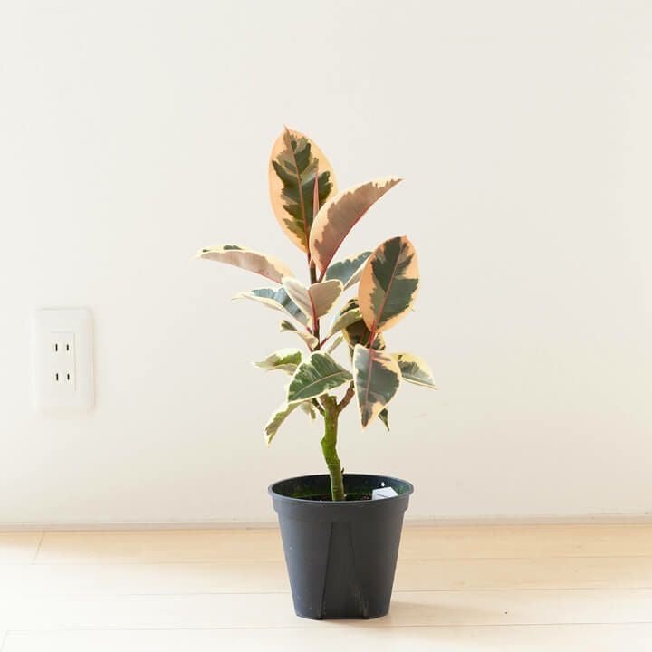 フィカス・ティネケは、別名「斑入りインドゴム」と呼ばれ、大き目の葉に入った斑がとてもキレイな品種です。