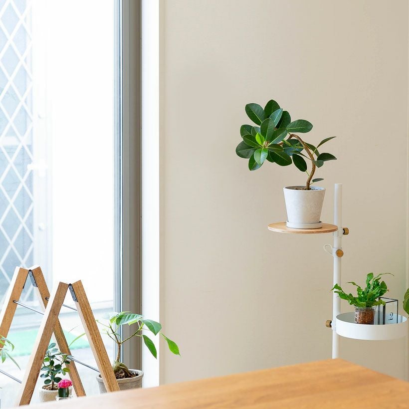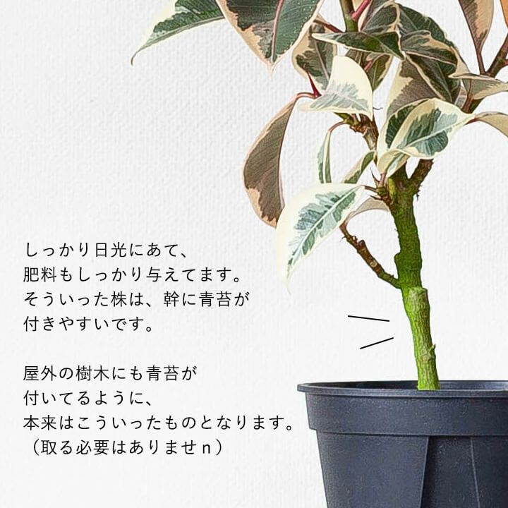 フィカスの仲間で、斑入り品種は見た目美しい。反面、葉が落ちたりストレスで枯れることも。なので地味に感じても、ナナの様な青葉品種はおすすめです。丈夫なので。剪定を繰り返したスタンダード仕立て!
