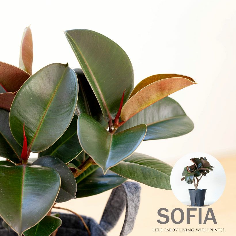 フィカス・エラスティカ・ソフィア。最近少しずつ流通が増えてきた、ゴムノキの注目品種です!見た目は黒ゴム(バーガンディー)とロブスターの中間的な印象。より詰まっている感じが、マッチョの可愛さがあります!