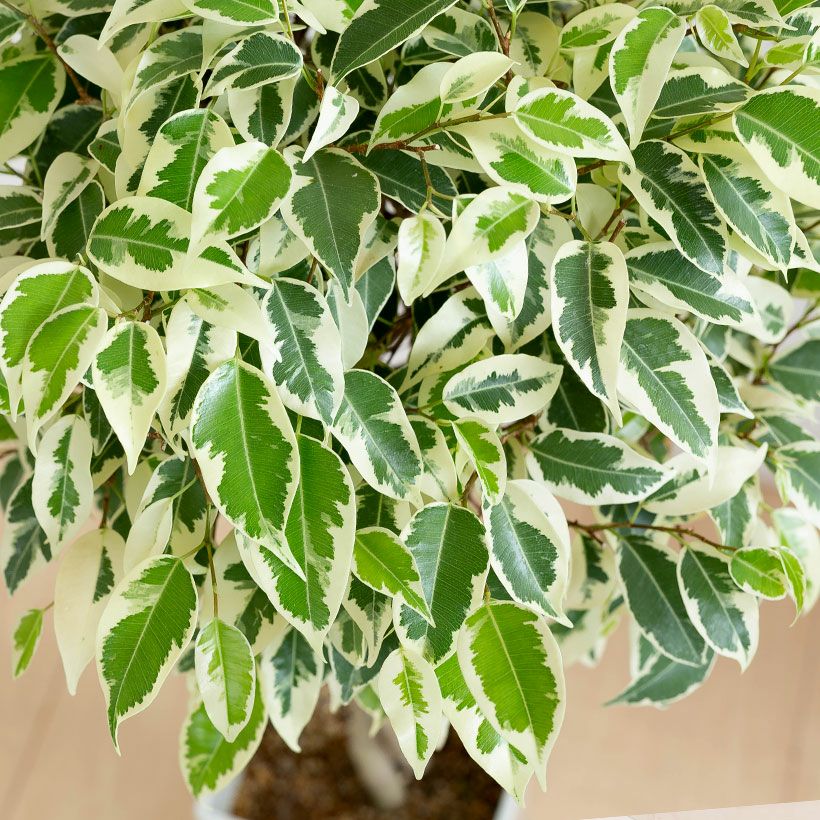 スターライトは、明るい雰囲気の爽やかな斑が入った葉が特徴の品種です。フィカス・ベンジャミンの枝変わり品種で、インテリアグリーンとして人気が高いです。