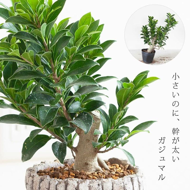 「大木」に育ったガジュマルの枝を切り分け、ポットに植え付け(=だから幹が太い)。