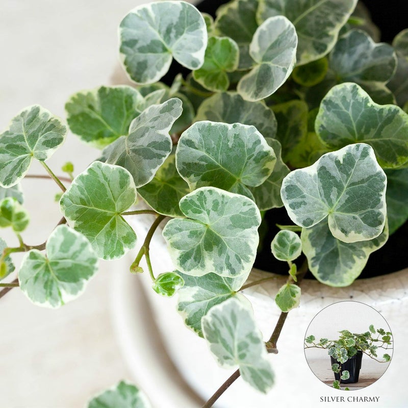 (地植えするなら、植栽用の安価なアイビーがおすすめ。シルバーチャーミーはヘデラの中ではブランド品種となるため、インドアグリーンであったり、屋外寄せ植えのワンポイントにいいと思います)